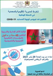 طبقا للتعليمات السامية و حملة التلقيح التي أعطى انطلاقتها جلالة الملك محمد السادس نصره الله و التي تستهدف كل المعنيين  من عملية التلقيح و بشكل مجاني ، تتواصل حملة التلقيح ضد كوفيد-19 لفائدة الأطر التعليمية بعمالة المحمدية ، التي انطلقت يوم الجمعة الماضي، في أجواء من التعبئة والمسؤولية من لدن مختلف الفاعلين وأعضاء أسرة التعليم.